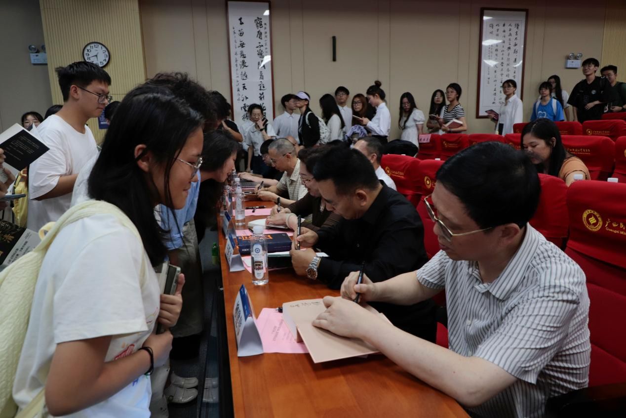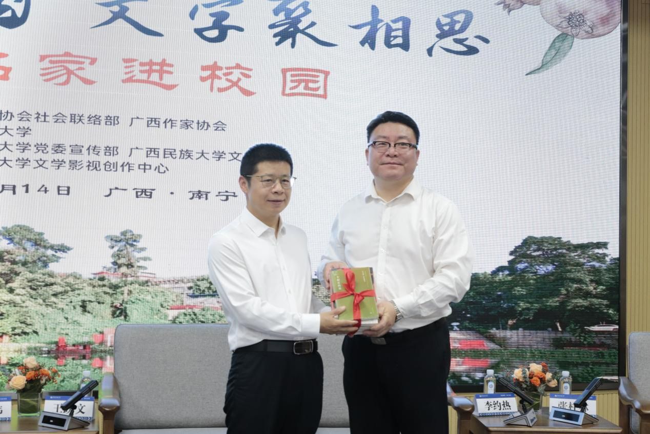 活动期间,中国作协向学校赠送受邀作家作品并由明升体育88潘骏源、刘莎莎两位同学朗诵作品片段。与会学生围绕对AI写作的看法、少数民族文学作品翻译和传承、广西民族文化基因和底色等问题与邀约作家进行交流。