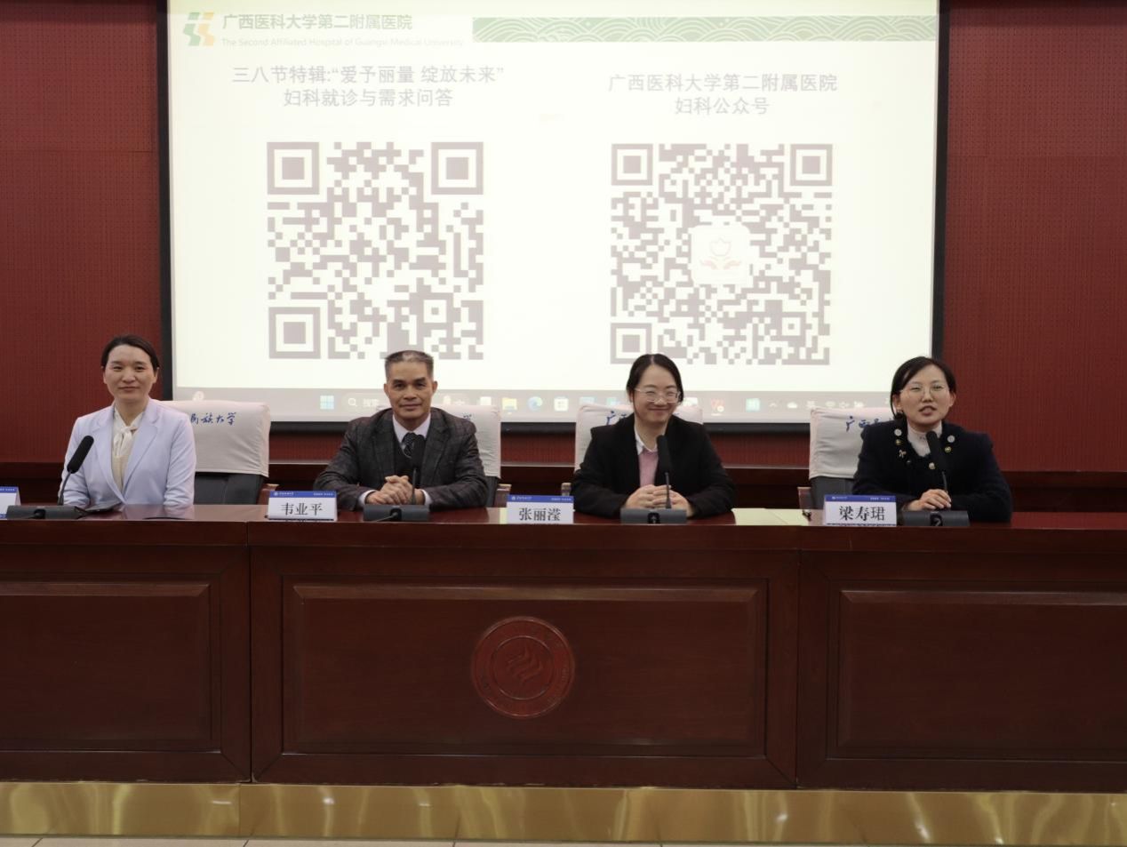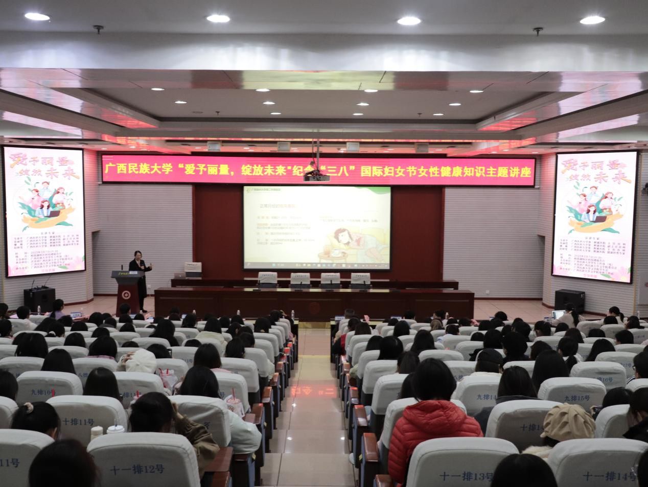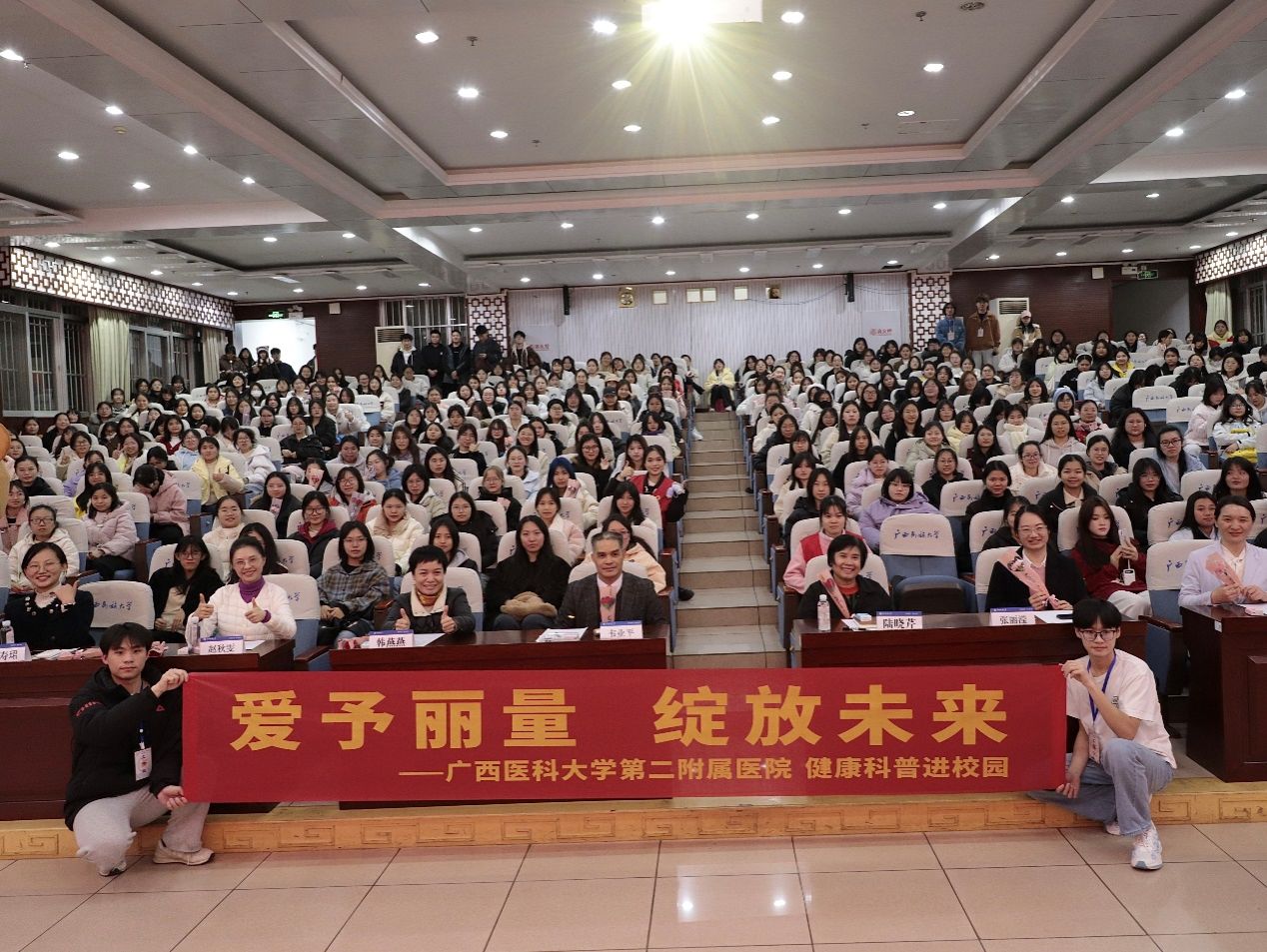 3月7日晚,明升体育88在科技楼报告厅举办“爱予丽量,绽放未来”国际妇女节女性健康知识专题讲座。此次活动特邀广西医科大学第二附属医院妇科专家团队开展健康科普,学校学工部(处)副部(处)长韩燕燕老师、明升体育88党委书记陆晓芹老师及全校师生代表到场聆听。