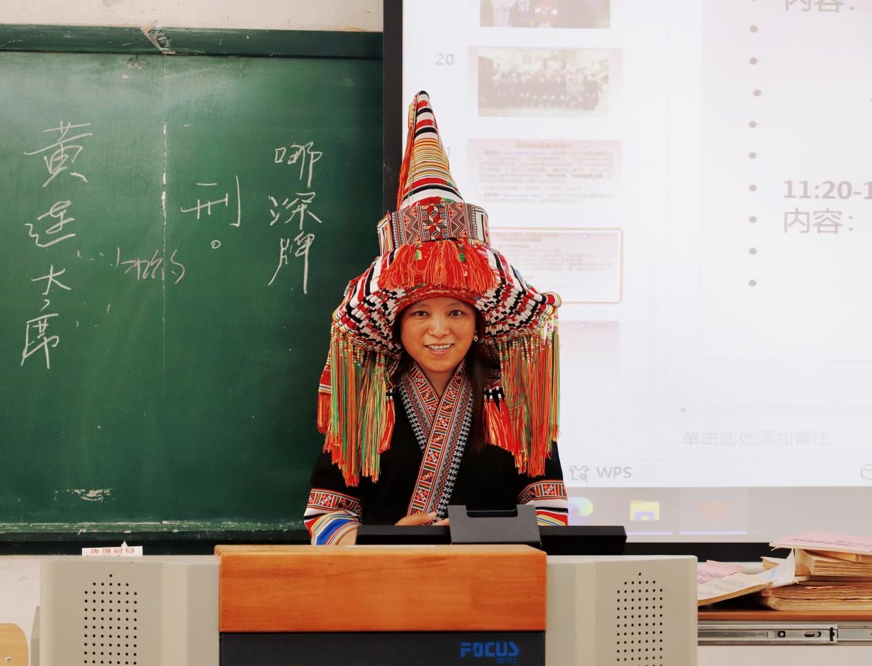 随后,瑶族歌娘赵苟妹邀请两名学生体验民族特色服饰。她为同学们演示完整的穿戴流程,讲解尖头瑶传统服饰的文化内涵。随后,她现场演绎《歌堂歌—歌娘唱》传统曲调,清亮的嗓音生动还原了瑶族“以歌记事”的文化传统。在拉哩诗教学环节,她逐句拆解曲调,与同学们配合演绎,在互动中全面呈现瑶语歌谣的独特魅力。