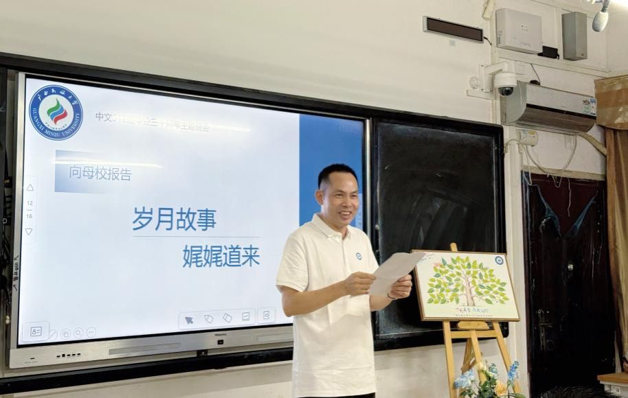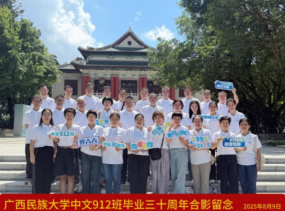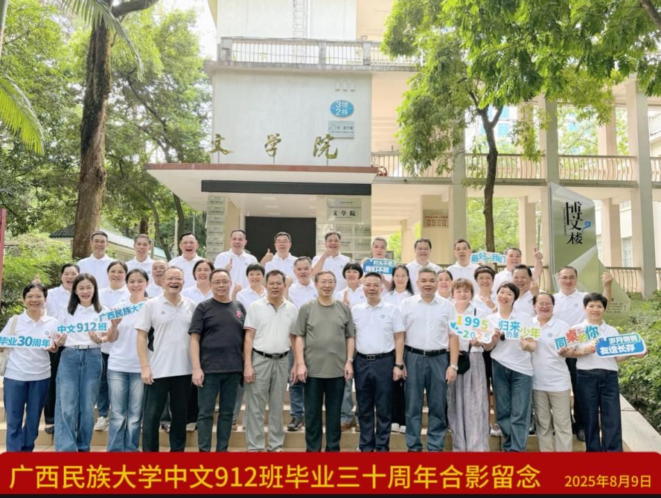 盛夏情谊浓,重逢正当时。2025年8月9日,广西民族大学明升体育881991级912班校友四海归航,齐聚相思湖畔,举行“卅载再聚,感恩同行”毕业30周年返校活动。广西民族大学原党委书记卞成林,学校党委副书记陈铭彬,明升体育88党委书记陆晓芹、党委副书记吴先源以及教师代表甘品元、郭金世等领导老师与30名校友共叙师生情谊。