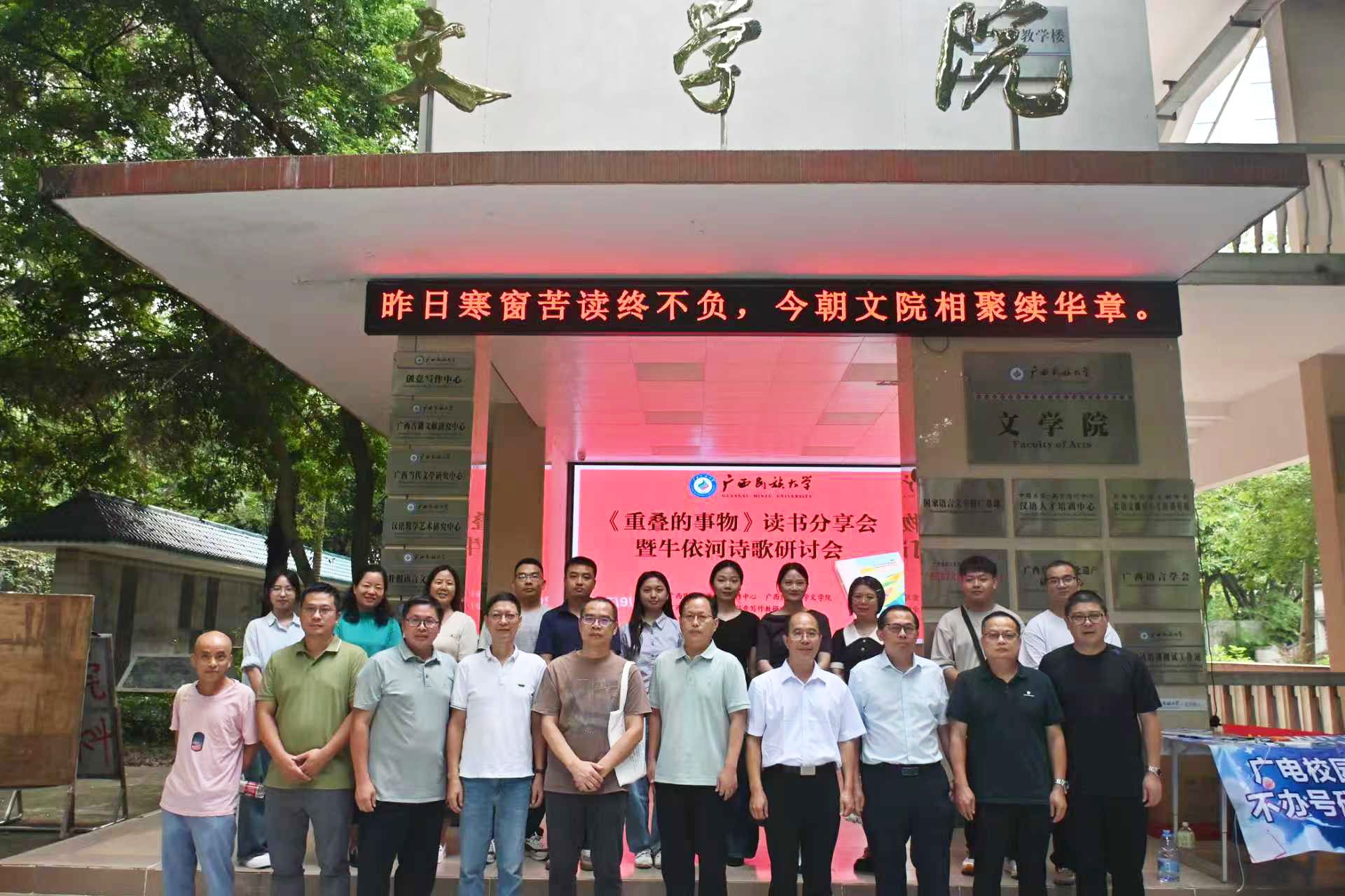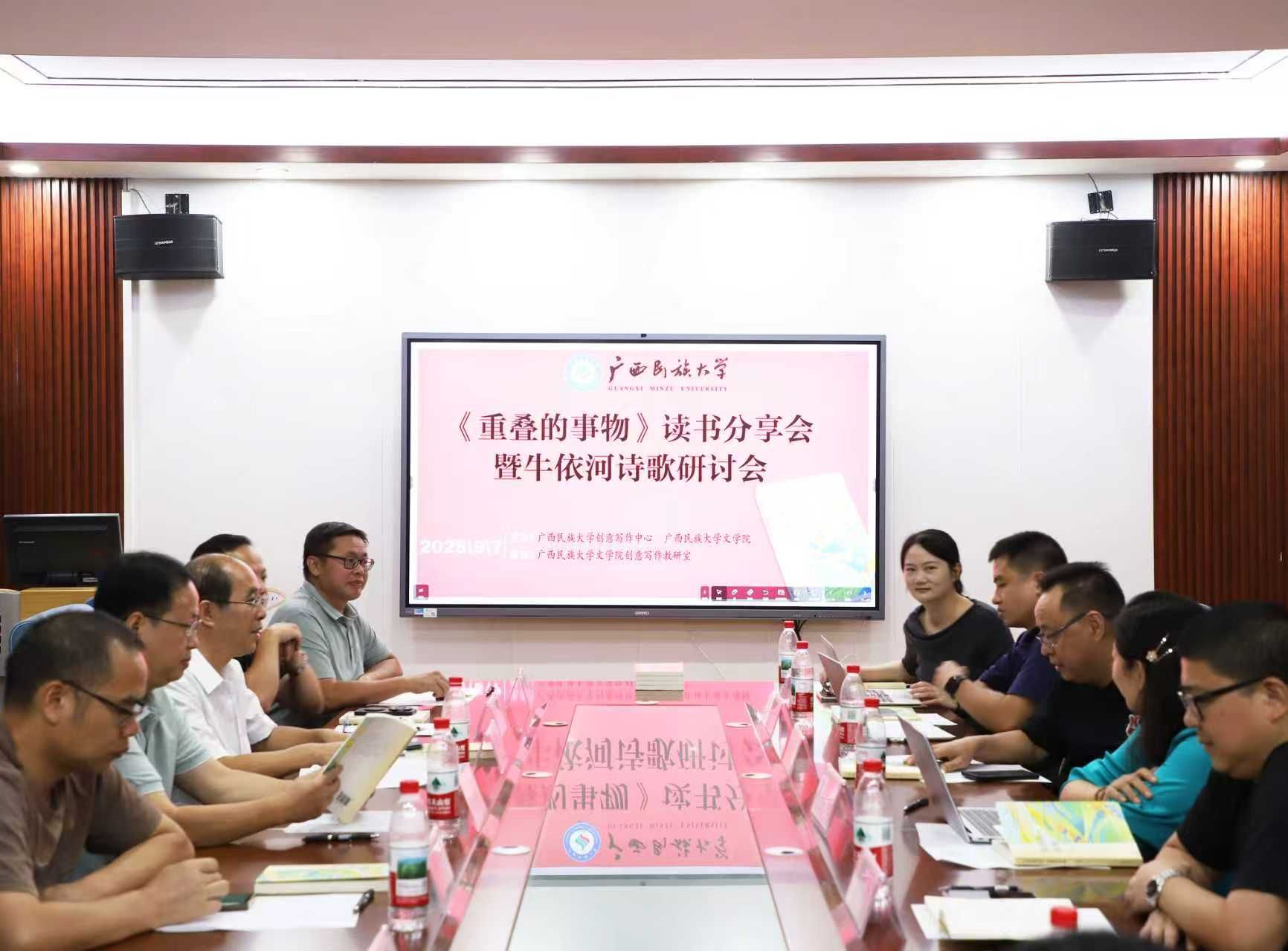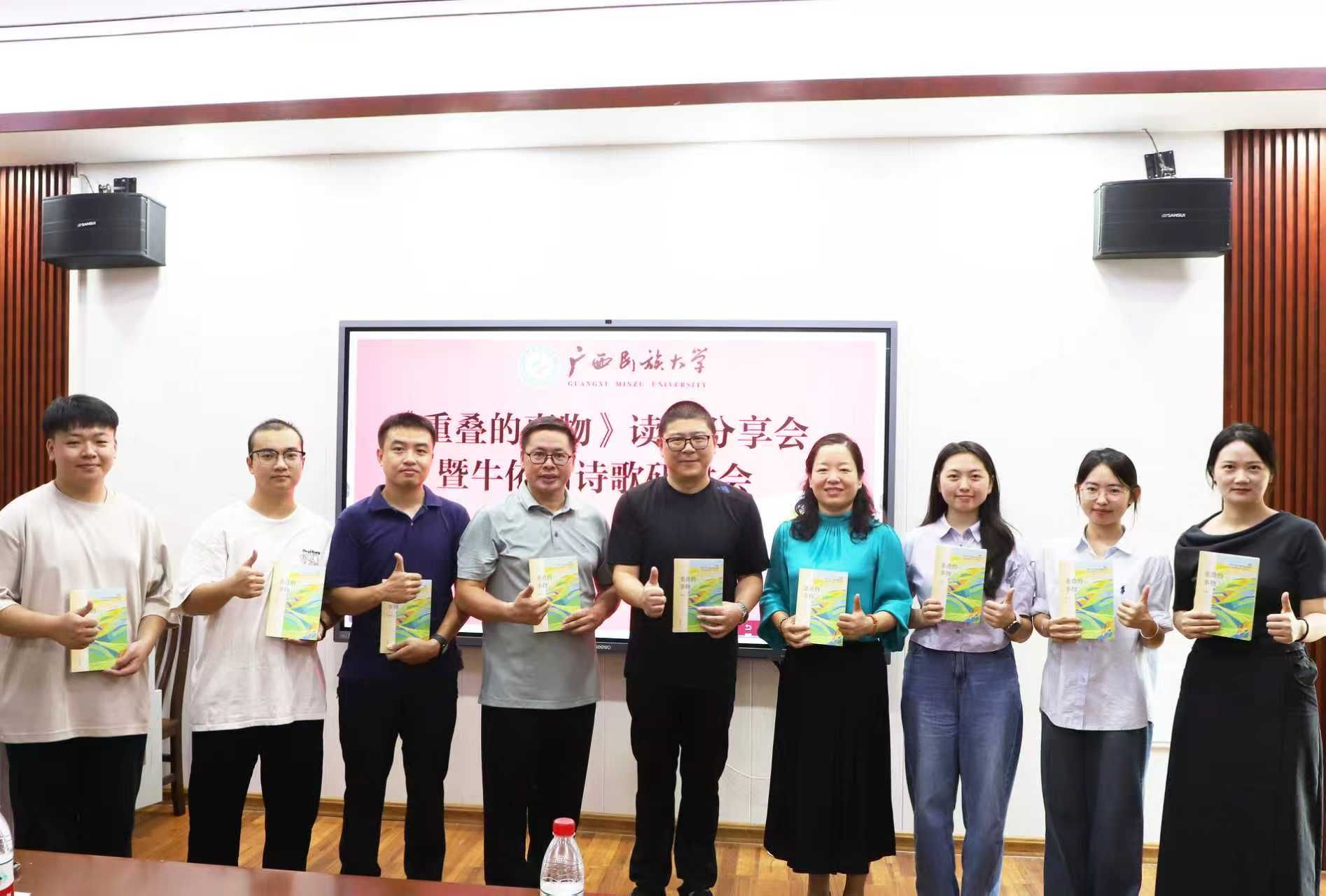 9月7日,《重叠的事物》读书分享会暨牛依河诗歌研讨会在广西民族大学明升体育88举行。广西作家协会副主席刘春、广西文艺评论家协会副主席丘文桥、广西作家协会秘书长杨合、自治区社科联科普部主任杨辉、南宁职业技术学院党委组织部(统战部、人事处)副部长李云华、南宁师范大学研究员钟世华、明升体育88党委书记陆晓芹及创意写作中心教师及学生代表出席本次会议。会议由我院杨逸云老师主持。