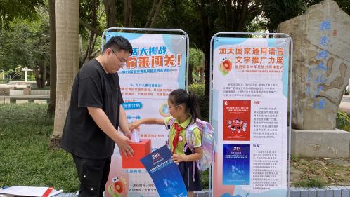 为强化师生参与体验,基地在五坡文化广场举办普通话知识问答竞赛,吸引了众多学生踊跃参与,覆盖小学、初中、大学等不同学段的学生群体。竞赛涵盖语音规范、成语典故、政策法规等内容,通过抽签、抢答等环节以赛促学、以学促用。现场还给每位参与者都发放了精美活动纪念品,让大家在轻松的氛围中提升语言规范意识。