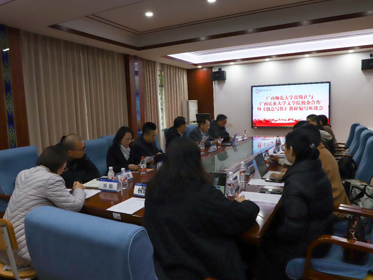3月6日,广西师范大学出版社与广西民族大学明升体育88校企合作暨《创意写作》教材编写座谈会在博文楼204会议室举行。广西师范大学出版社社长张贻松、营销部主任杨睿一行,区内外教师代表,我院党委书记陆晓芹、创意写作教研室教师代表出席座谈会。创意写作教研室主任董迎春主持会议。