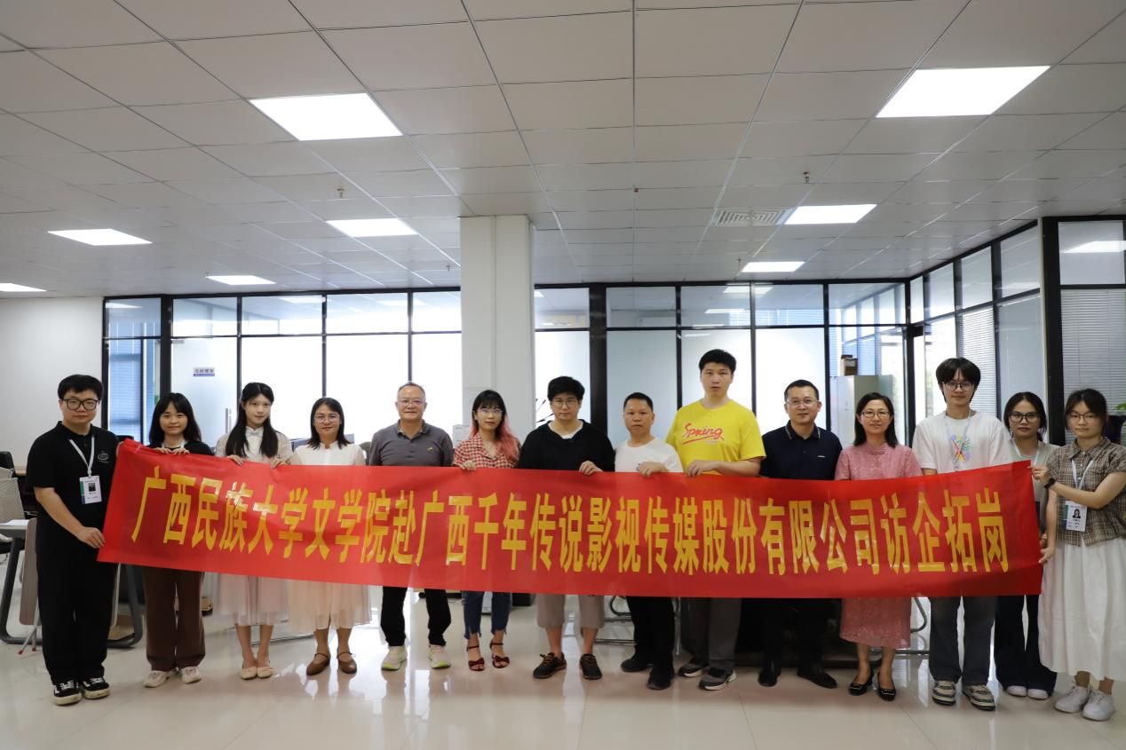 为深化校企交流合作,拓展学生就业视角,拓宽学生就业渠道,6月3日下午,明升体育88党委副书记吴先源,外国文学教研室黄玲、李忠敏、蔡勇庆等老师带领明升体育88戏剧与微电影工作室成员前往广西千年传说影视传媒股份有限公司开展访企拓岗促就业活动。广西千年传说影视传媒公司张耀安主任、梁伟基导演、韦晗依编剧热情接待,双方开展会谈与交流。