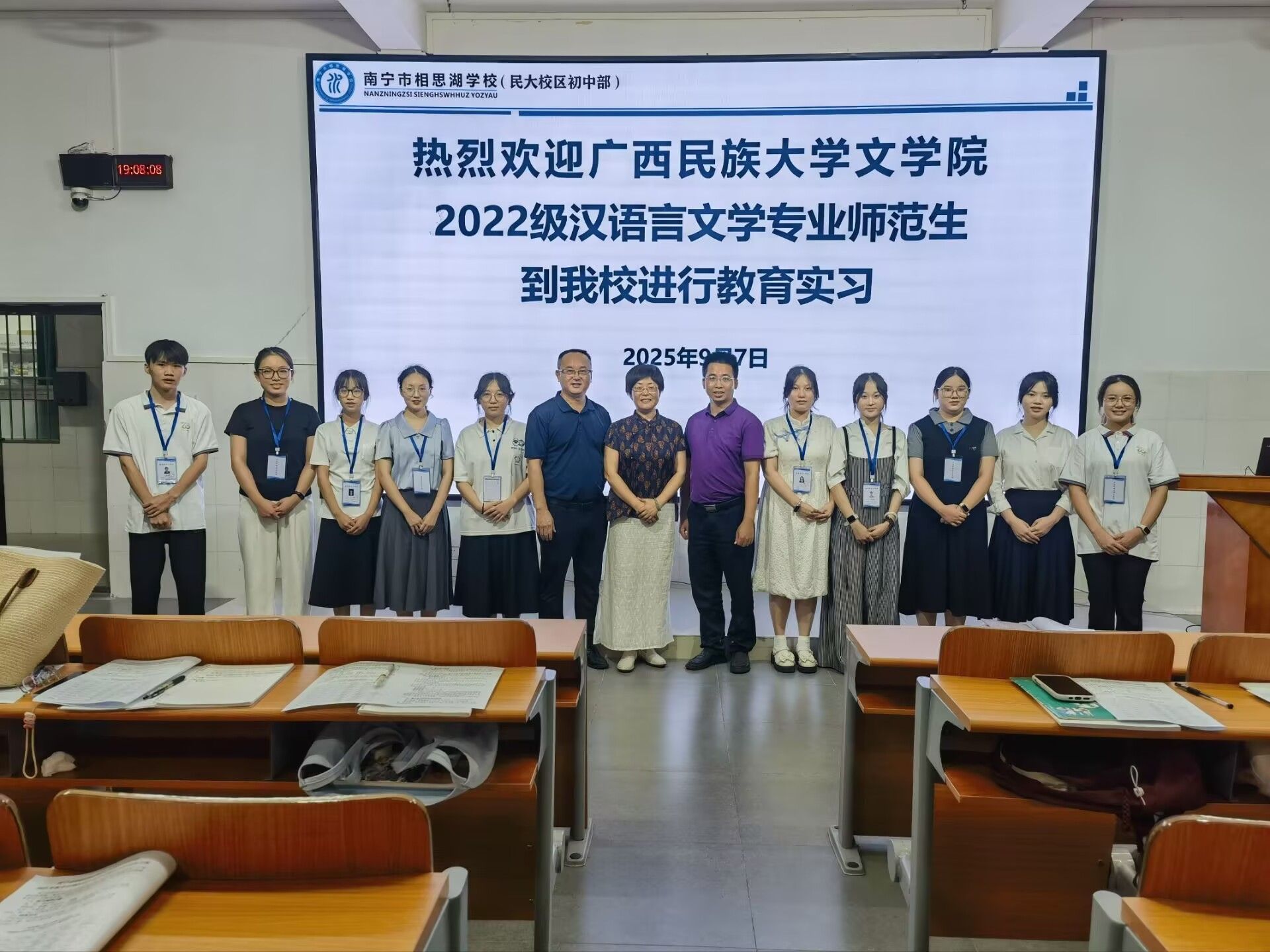 9月7日,我院2022级汉语言文学(师范)专业10名学生赴南宁相思湖学校民大校区初中部参加2025年秋季教育实习见面会,正式开启本学期教育实习工作。相思湖学校民大校区初中部政教处主任韦永俭、德育处主任龙家旺,我院语文教研室吕晓燕、罗红流2位老师,以及七、八年级各班班主任与全体实习生共同参会。会议由韦永俭主任主持。