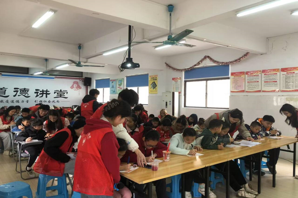 志愿者协助小朋友们写信