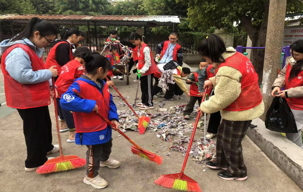 志愿者和小朋友们一起打扫社区