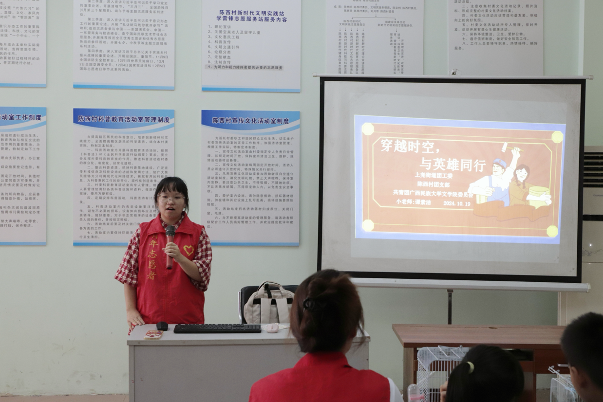 10月19日下午,明升体育88志愿者赴上尧街道陈西村新时代文明实践站开展“穿越时空,与英雄同行”爱心主题课堂活动。2023级汉语言文学师范2班谭素洁担任此次活动的主讲人。
