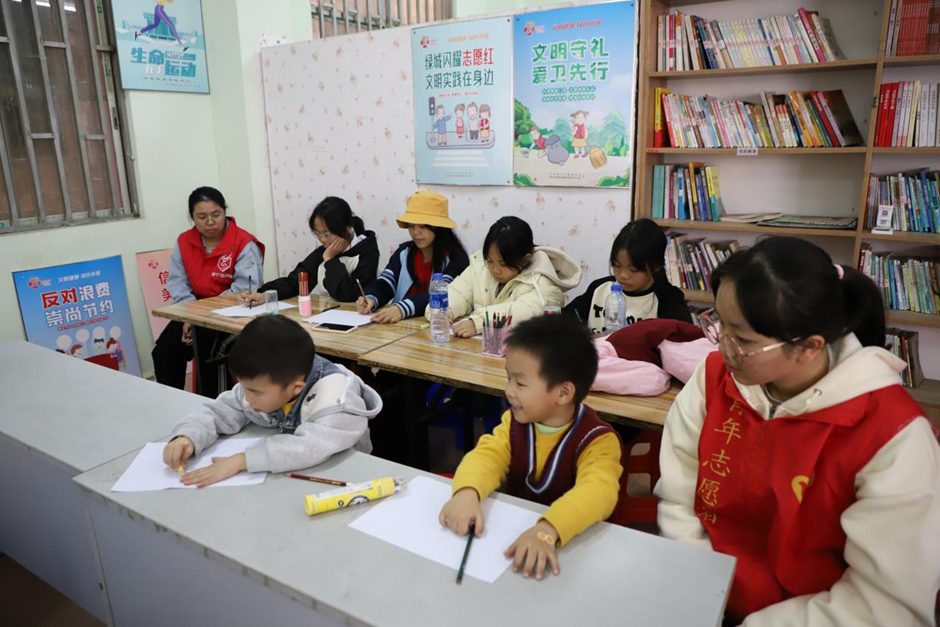 课堂上,梁卓娴通过生动的故事和趣味游戏,向小朋友们讲述了元旦的由来和传统习俗,小朋友们听得津津有味,课堂氛围有趣。随后,她通过“画出你心中的元旦”环节将课堂推向高潮。志愿者们耐心指导小朋友们画出心中的元旦图画,鼓励她们发挥自己的想象力,用画笔描绘出对未来憧憬和对家人的祝福。小朋友们稚嫩的笔触饱含着纯真的情感。在志愿者和孩子们的共同努力下,一张张充满创意的贺卡诞生了,现场洋溢着欢声笑语。