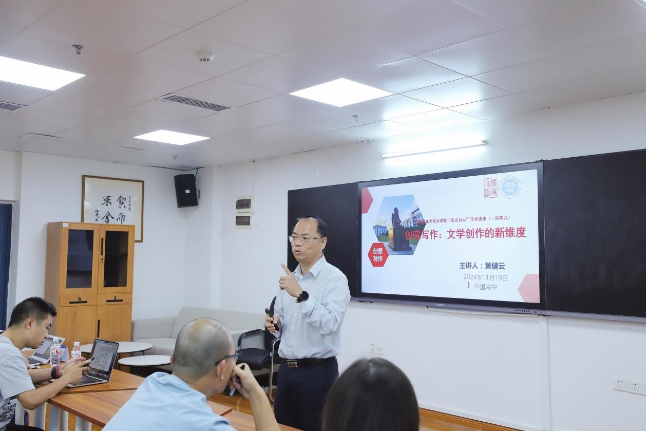 11月19日下午,明升体育88“言文行远”学术讲座第一百零九讲在文综楼1102顺利举办。此次讲座的主题为“创意写作:文学创作的新维度”,由玉林师范学院教授、教育部高等学校评估专家黄健云主讲,广西民族大学创意写作教研室教师杨逸云主持,明升体育88部分师生到场聆听。